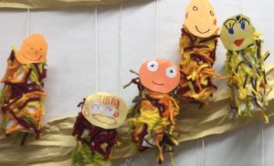 木の枝に見立てた壁面にカラフルでいろんなお顔のみのむしがゆれています。
