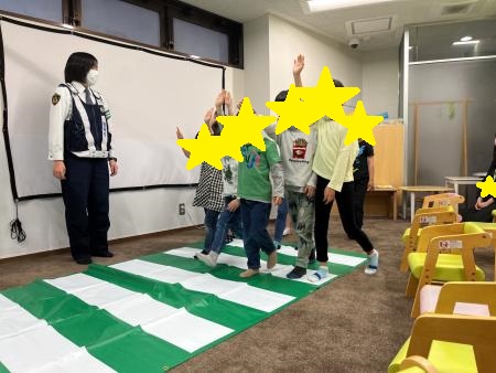 本物のおまわりさんに子どもたちみんな大興奮しながら楽しく交通ルールを学ぶことが出来ました。