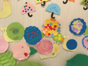 さて、柏教室では6月の製作で「傘・カタツムリ・あじさい」を作りました。