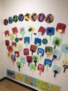 うちわの形が完成したら、次はシールやクレヨンで自分だけのうちわを作ります。