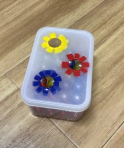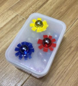 プラスチックケースにビー玉が通り抜けない程度の小さい穴をあけて、穴の周りをテープで貼って完成です♪