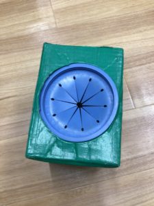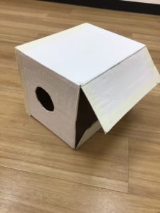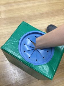 子どもが抱えられる程度の大きさの段ボールに穴をあけ、百均などで買える排水溝用のカバーをはめこんで目かくしにします。