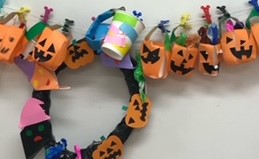 そして、折り紙の端を捻って作ったり🍬ぬりえしたキャンディー🍭をカボチャバケツに入れました🍬💓