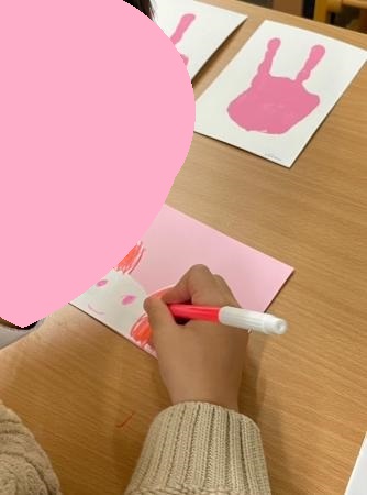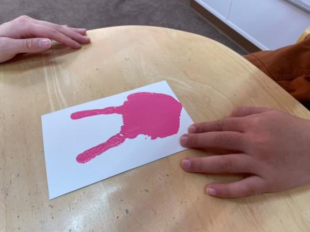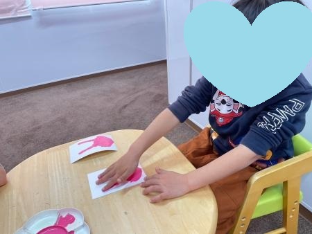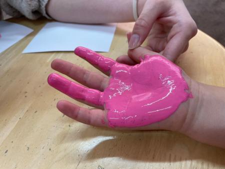 まずはピンクの絵の具を人差し指と薬指と手のひらに塗ります。