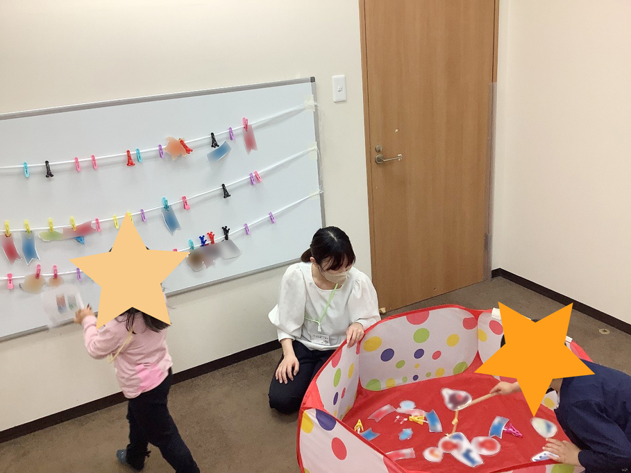 釣ったお魚を洗濯ばさみに挟んで飾ったのですが、洗濯ばさみがお魚でいっぱいになると「沢山釣れたね♬」と嬉しそうな表情で笑いあう子どもたちを見てこちらも幸せな気持ちになりました☺