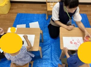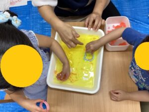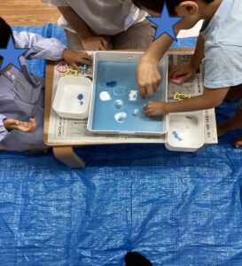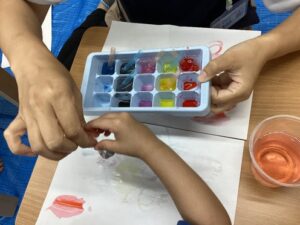 色のついた氷を溶かしてお絵描きを楽しんだり、水に溶かしたりして色の変化を楽しみました!