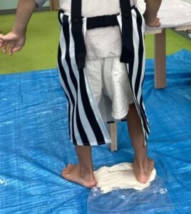 手でこねたり、足で踏んだりと全身を使って作りました。