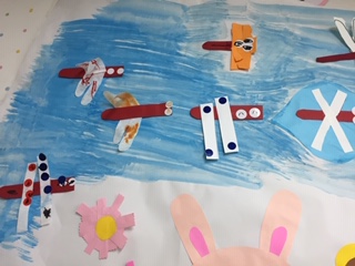 にじみ絵では、色の理解や色彩感覚が養うことができ、はさみでは、手先の技巧性や、切ったものを重ねて貼ることで空間を把握する力を養うことができます☆