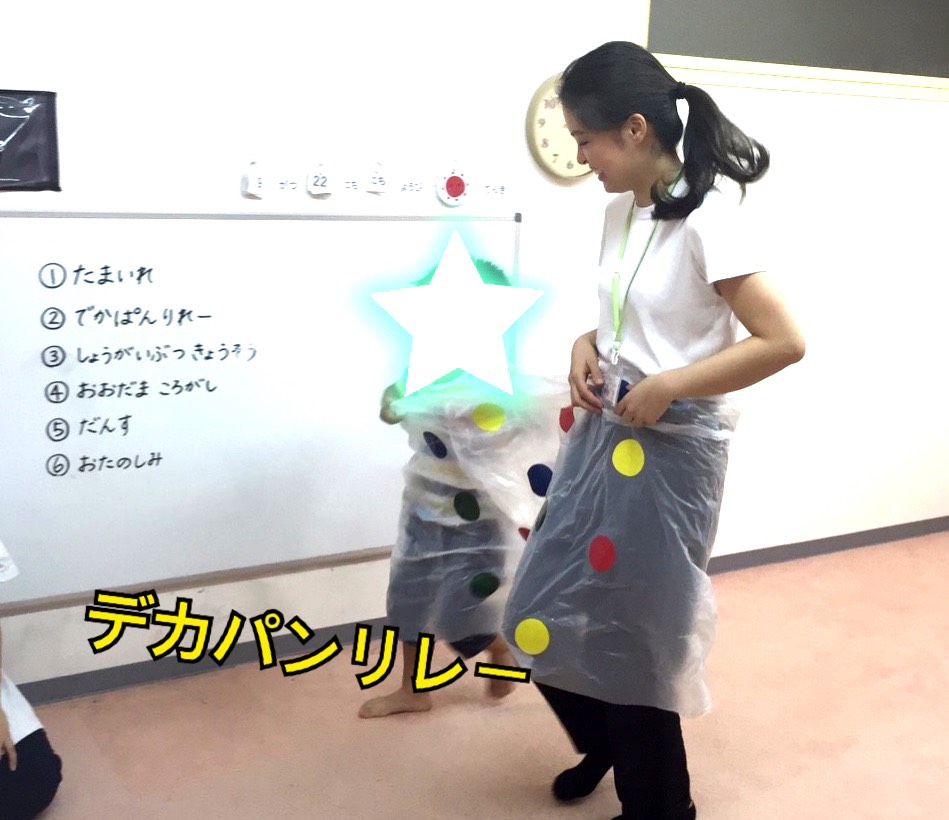 障害物競争やデカパンリレーでは、手作り物を出すと「何それ~」とウキウキしている様子で先生のお話を集中して聞いている子どもたち、いつもとは違う雰囲気にウキウキしている様子でした