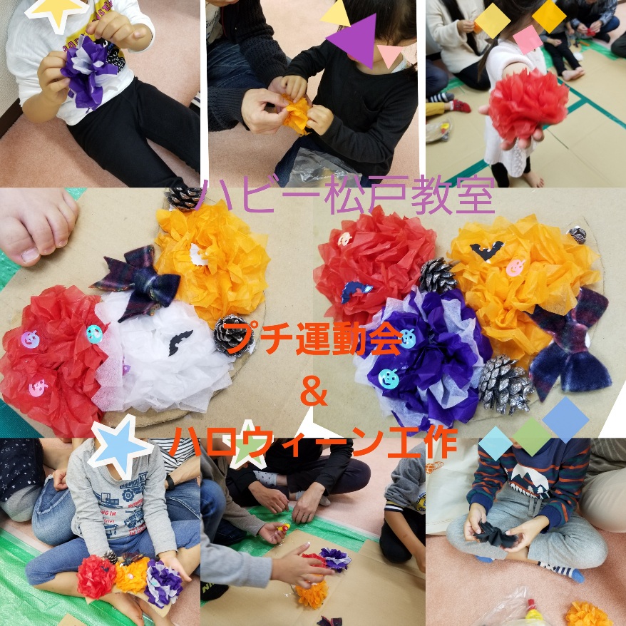 まずは、ハロウィーン工作でリース作りをしました。お花紙で3色のお花を折り、まつぼっくりやハロウィーンビーズを台紙に貼って、自分好みのリースを完成させました。お父さん、お母さんと協力して、みんな楽しく集中して制作できました!