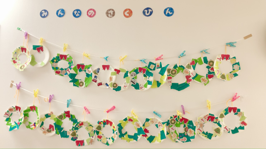 集団の時には、お友達とお揃いのリースを作る子ども達や、大好きな車や電車を貼る子どもたちもいました!