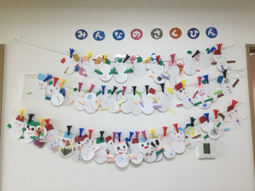 年中クラス年少クラスのお友達ものりやクレヨンを使って上手に作り、思い思いの雪だるまを作ることができました。お友だちの中には、「大阪は雪降るかな~」と少し楽しみにしている様子もありました![]()