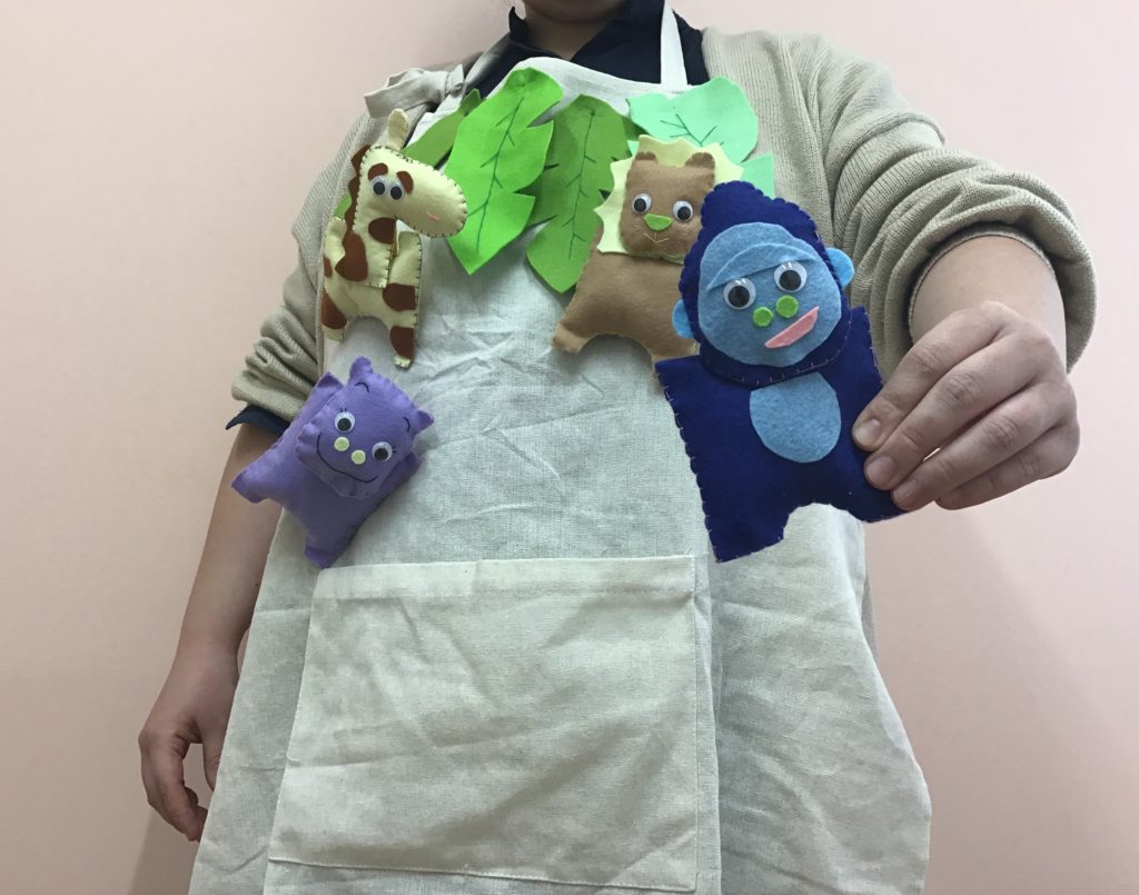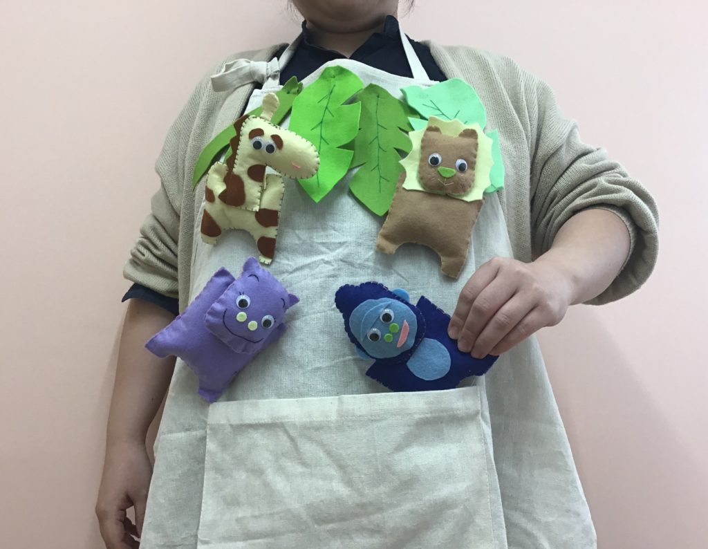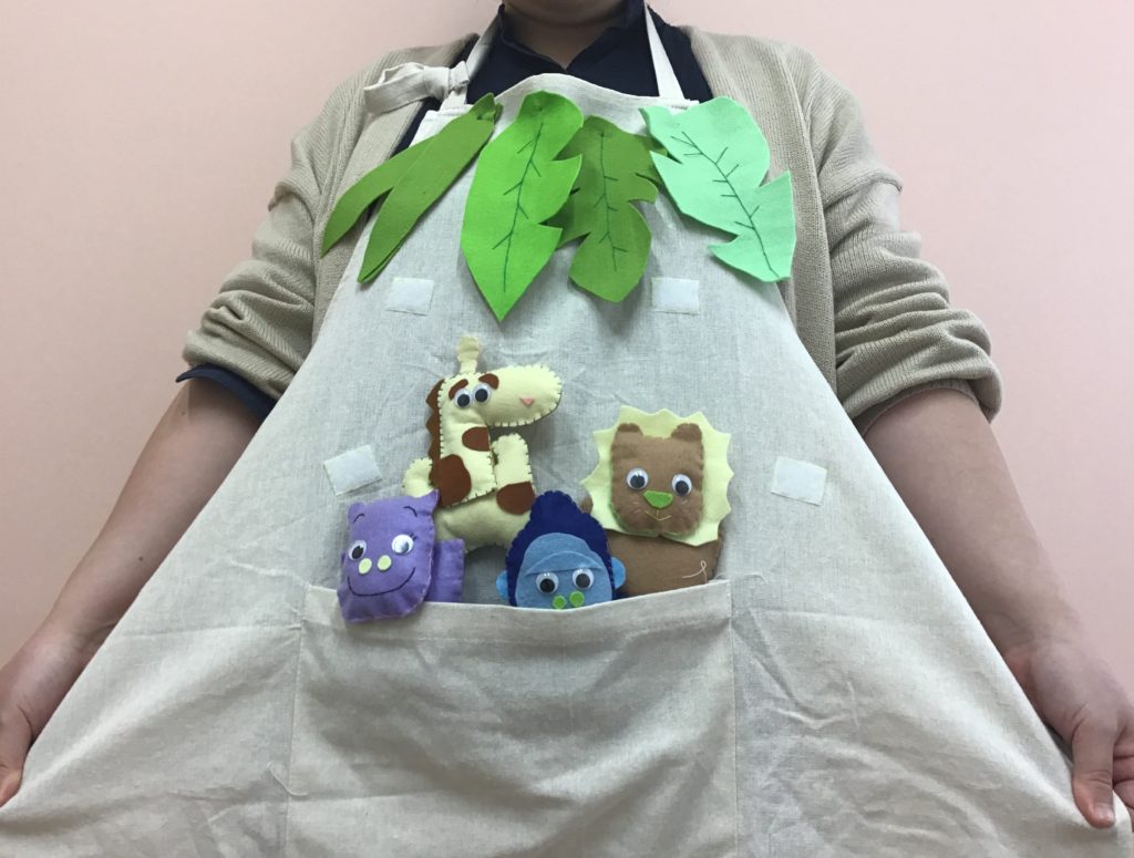 エプロンシアターとはポケットから人形を取り出したり、エプロンに貼り付けたりして