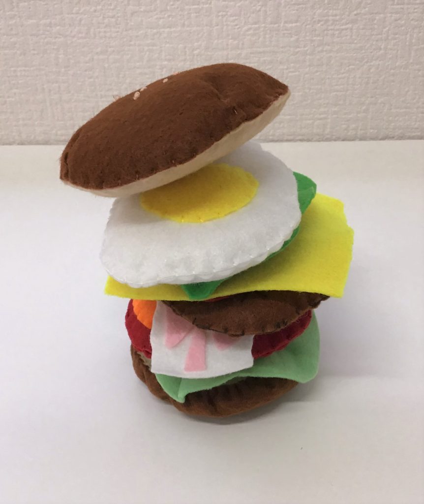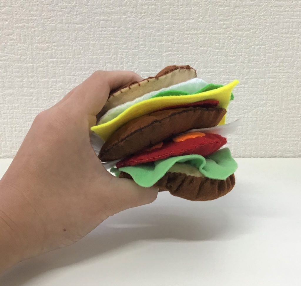 パンの間にすべての具材を積み上げるとこのようになります。崩れないようにそっと一つずつ重ねていくことで力のコントロールが可能になり、