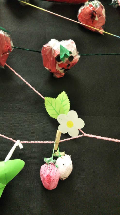 いちごのつるを模した毛糸には、先生たちが作ったいちごの花と葉、それにちょうちょもとまっています。