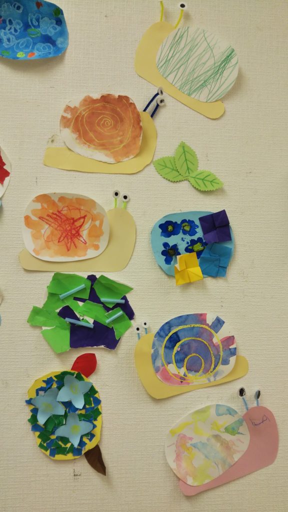 クレヨンや絵の具で殻のもようを描いたお友達もいれば、折り紙をちぎって貼ったお友達もいます。ストローを使って吹き流しをしたり、指を使ってフィンガーペイントをしたりと、今までやったことのない技法にチャレンジできたお友達も。![]()