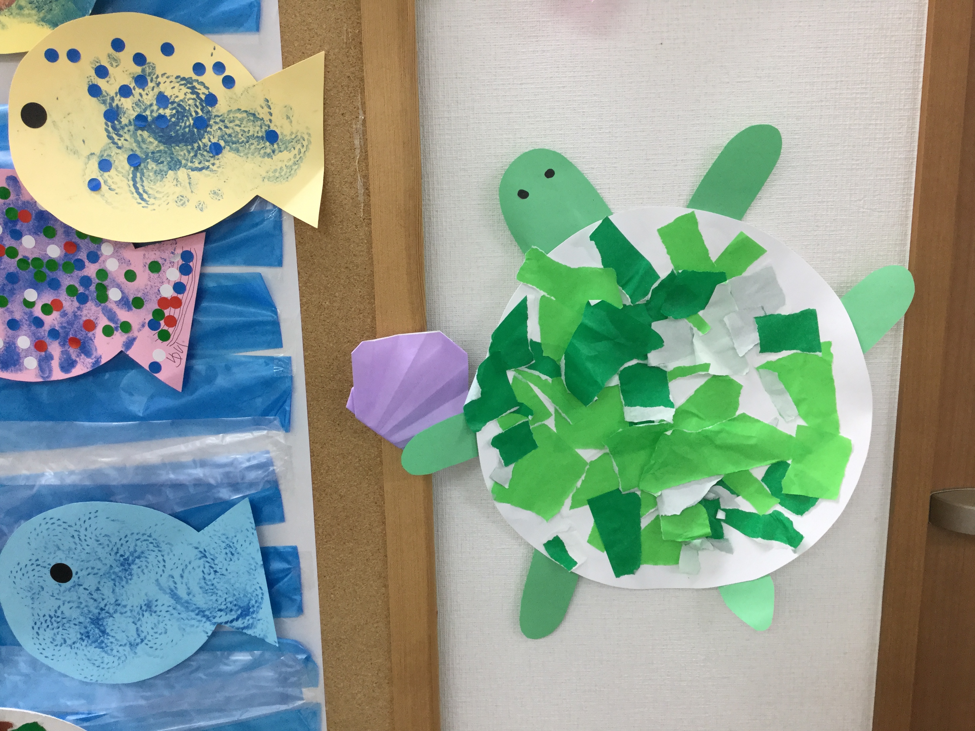 大きな亀は、集団でお友達と一緒に折り紙をちぎってペタペタ。