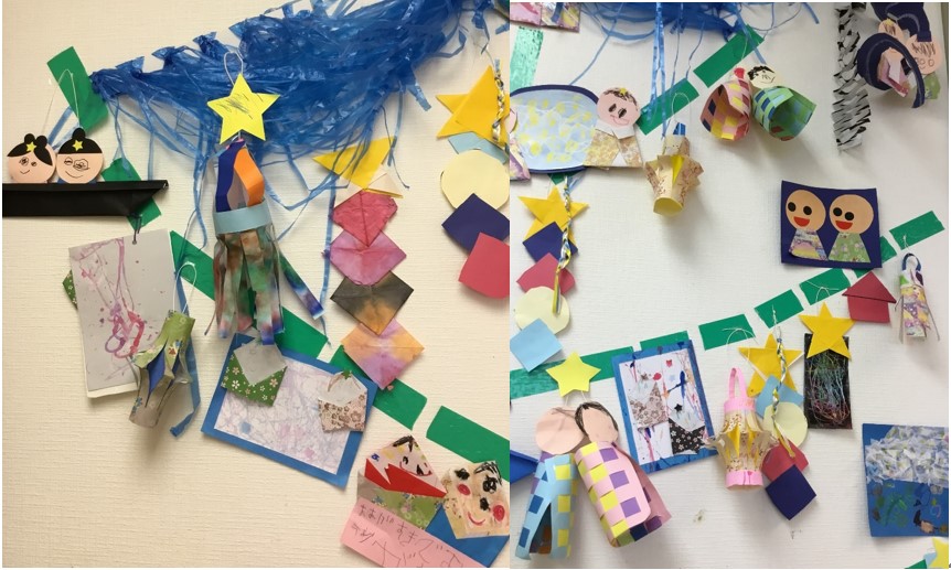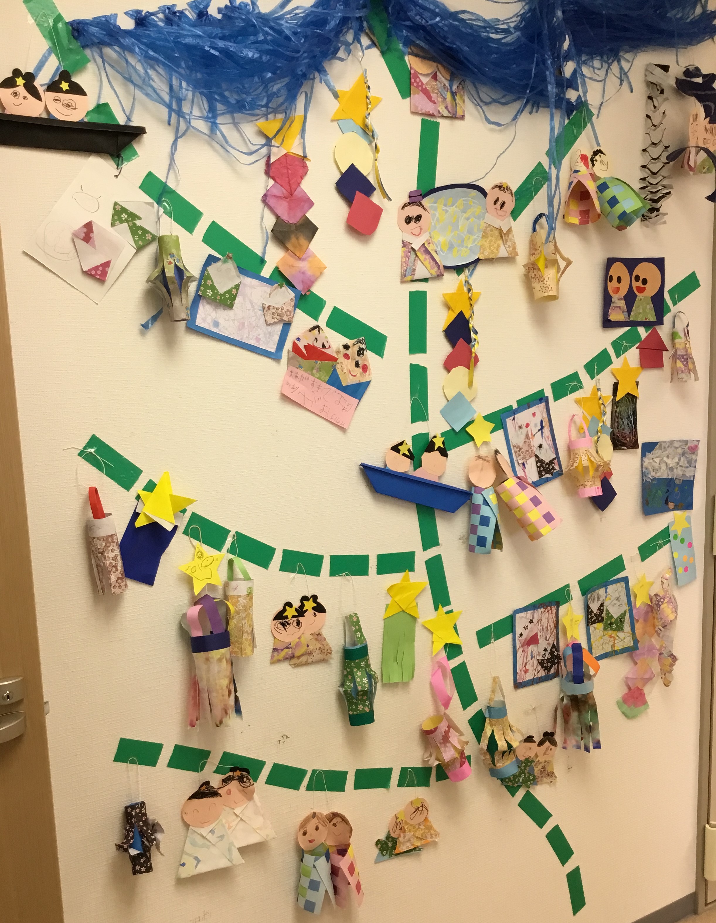 織姫と彦星はもちろん、願いごとを書いた短冊、提灯や吹き流し、星に天の川など、カラフルなたくさんの七夕かざりが壁一面に飾られました。「これはなあに?」「きれいだねー」と、毎日増える新しい七夕かざりに、皆目をきらきらさせていました。
