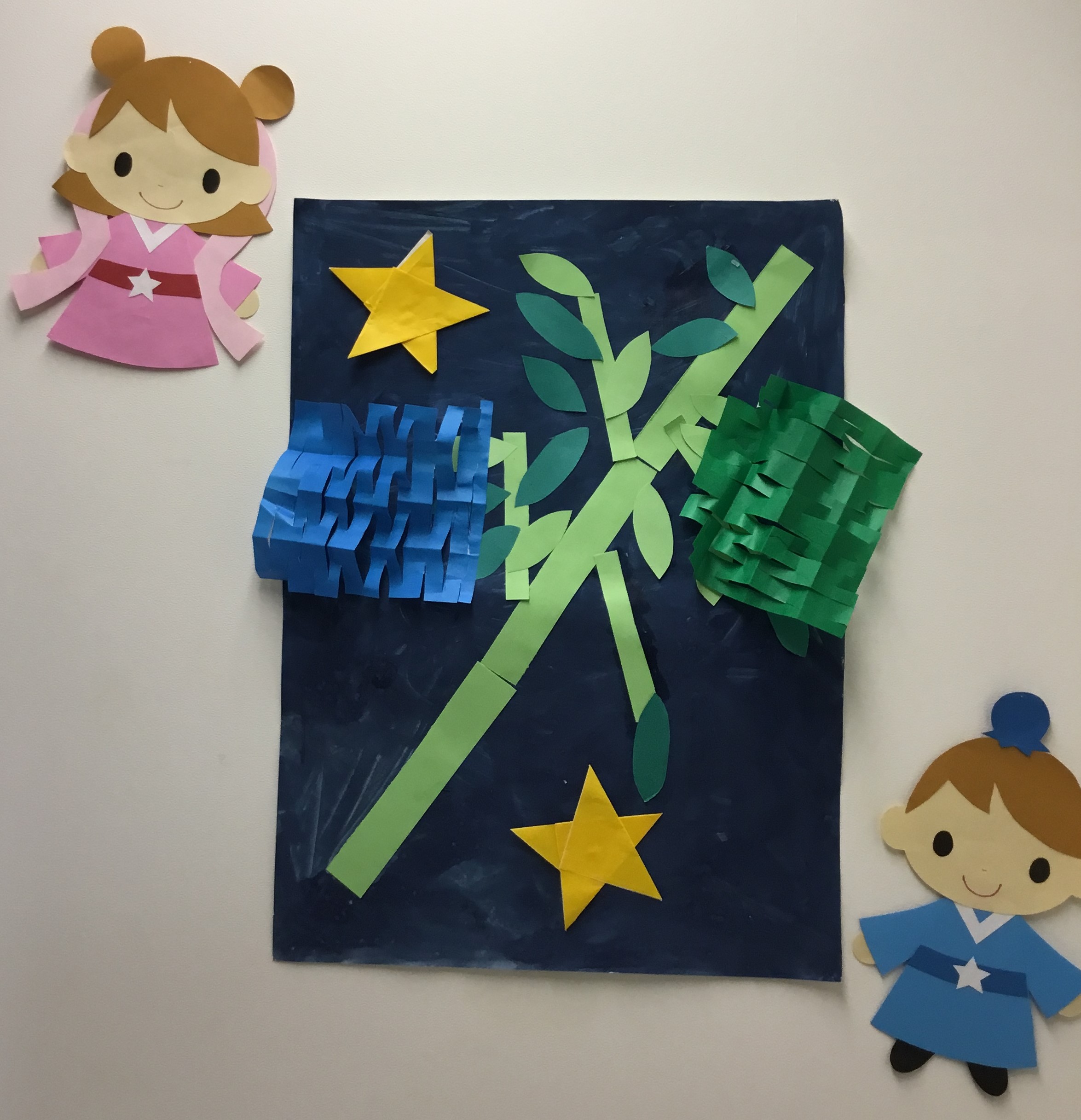 左上には舟に乗って天の川を渡る織姫と彦星がいます。舟は折り紙で作りました。折り紙は苦手意識の強いお友達も多いです。「難しそう…」とやるのをしぶっていたお友達も、1つ1つ工程を聞いて、完成させることができました。苦手なものができると大きな自信になりますね。