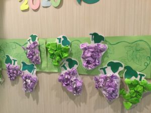 作り方は、1枚の折り紙を半分に折ってその線に沿って手でちぎり、その半分の折り紙を小さく丸めて貼っていき、ブドウの房の出来上がりです。