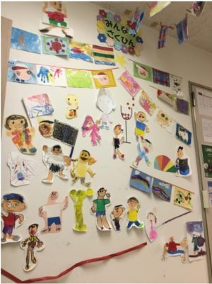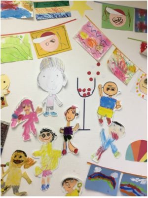 製作の前には絵本を読んだり運動会練習の話をしたりしてイメージをふくらませました。「運動会では何をするかな?」という質問に、一番多かった答えは「かけっこ」。壁にもやっぱりかけっこの作品が多かったです。ゴール(写真の左下、赤いテープです!)に向かって皆並んでいます!さあ誰が1番かな?