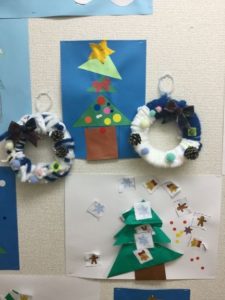 クリスマスツリーをメインにこの時期らしい工作で教室も冬景色です。