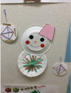 紙皿で作った「雪だるま」。ひもをとおして作った雪の結晶柄が素敵
