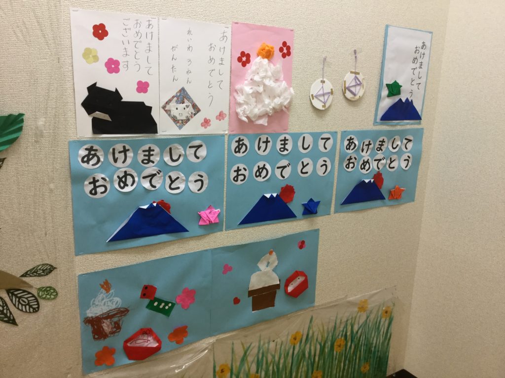『あけまして おめでとう』の文字練習をかねての大きな年賀状や富士山の初日の出の壁画は、主に年長さんが作りました。