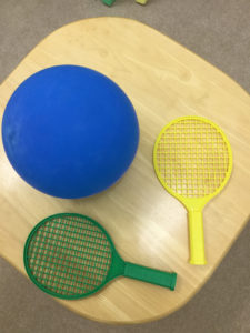 ・ラケットで風船を打ち返す際には飛ばす方向は分かっていても、風船にラケットを当てられなかったり後ろに飛んでしまったりすることがあります。目で見て合わせて腕を振る等を遊びながら練習をしていき「協調運動」ができるようにしていきます。