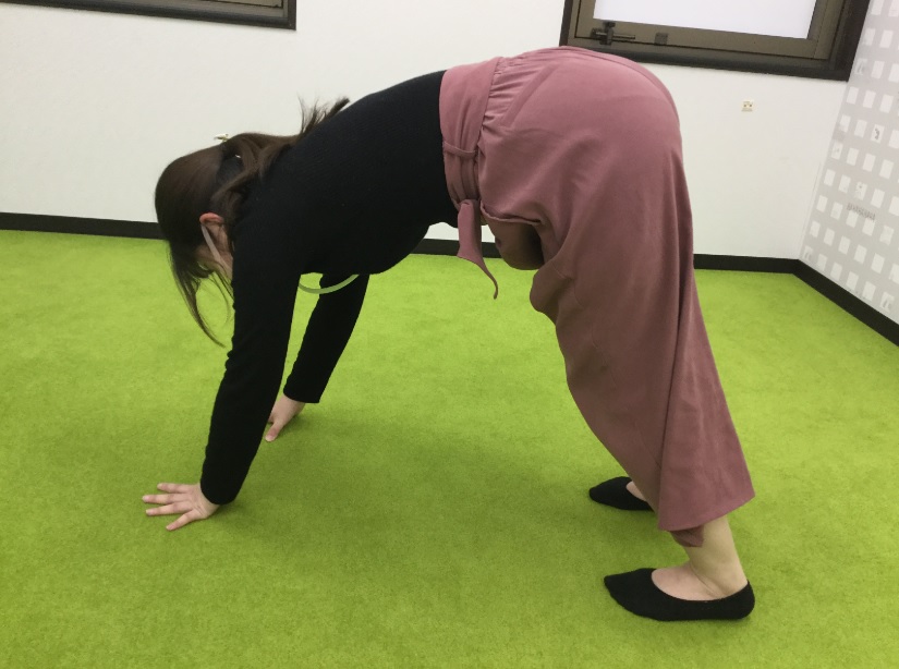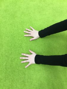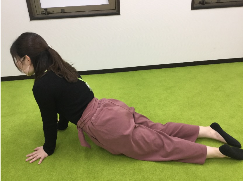 両腕を伸ばし、両手を床につけます。足は閉じて床につけたまま、腕の力だけで前に進みます。この時手の向きはまっすぐだとうまく進めない為、手は外側を向くようにつくと進みやすいです。