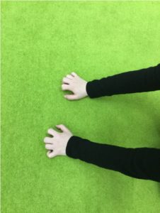 ↑こちらの右の写真では指が丸まってしまい、体重を手のひらの下部のみで支えていることになってしまいます。手を開くように声を掛けてあげましょう。