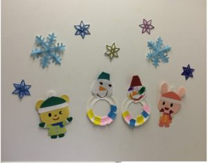 玄関は年少・年中のお友達が雪だるまを作ったり雪の結晶に色を塗ったりしてくれました⛄