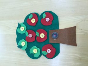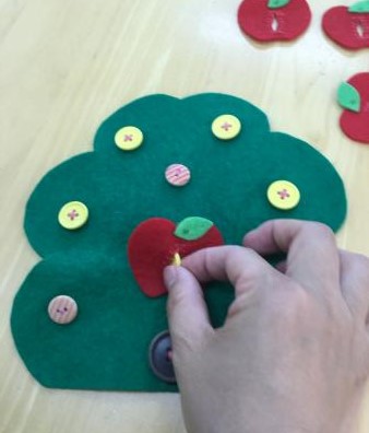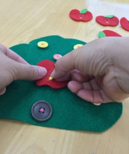 りんごの色が違うのでボタンの色とマッチングしてみたり、数のお勉強にもなりますね♪