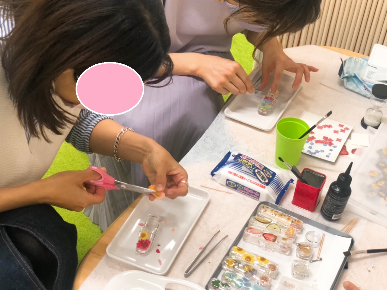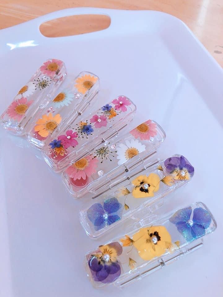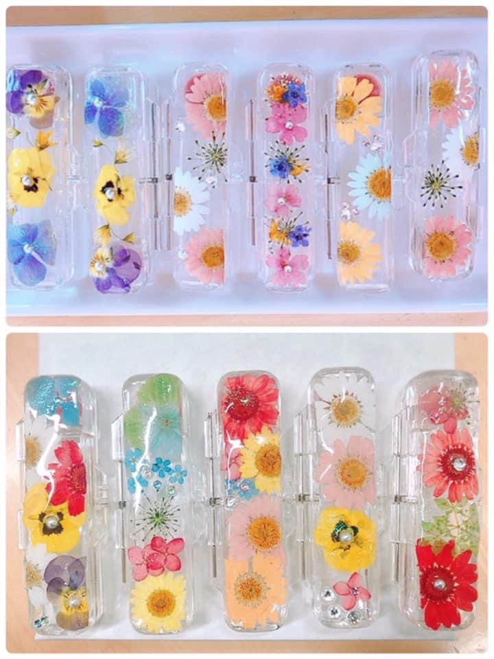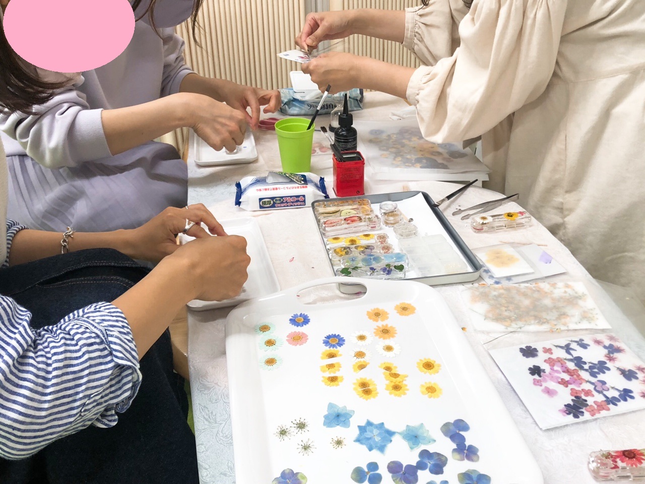 たくさんの押し花の中から自分の好きな花を選んで頂き、レイアウトを考えてレジンで硬化させて仕上げます♪