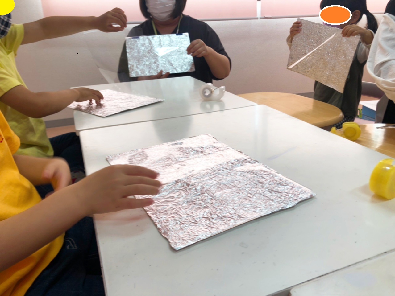 強くやりすぎると広げづらくなるので「優しくふんわりねー」と声かけをして行いました。力のコントロールの練習です。しわをつけたら厚紙に貼ります。