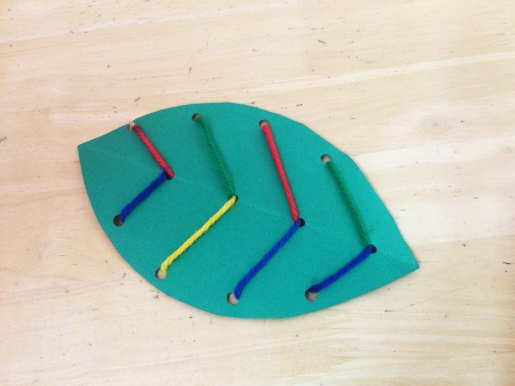 葉っぱのふちや真ん中にパンチで穴をあけ、毛糸を表裏交互に通していき手先の訓練を行いました。毛糸を通すときに表から通すのか裏から通すのかわからず苦戦するお子さんもいましたが、そんなときに「先生手伝って」と声を掛けて、指導員と一緒に取り組みました。