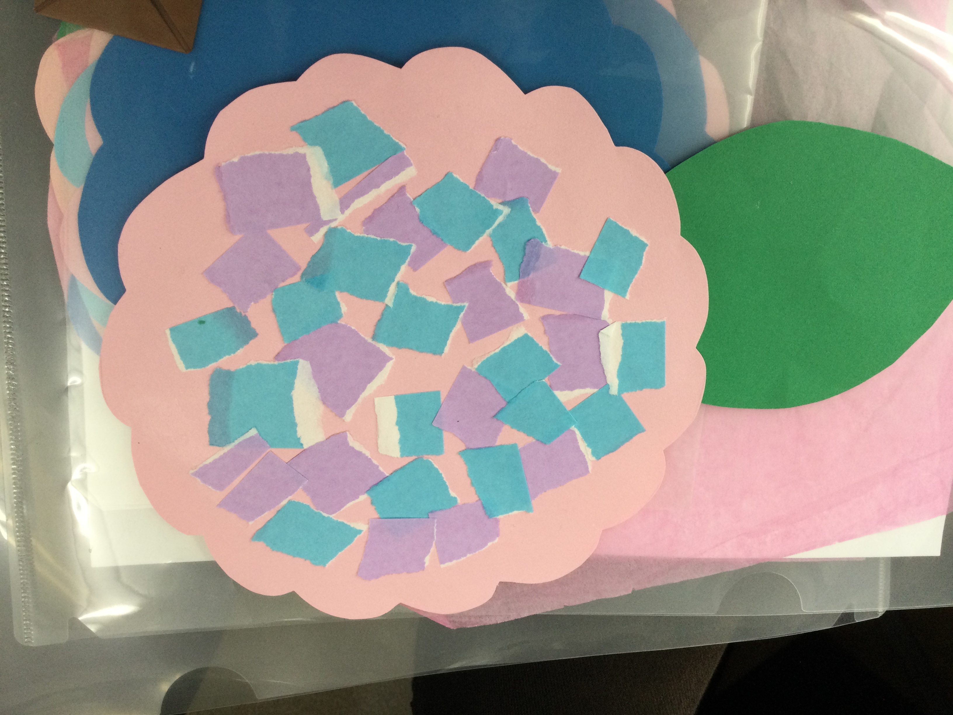 壁には梅雨にピッタリな雨や葉っぱを先生が作って貼り付け、その中にみんなが作った作品が沢山貼られた事で、壁一面があじさいで埋め尽くされ、華やかになりました。