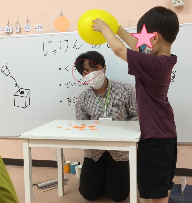 ティッシュでこすった風船を机に近づけると、机の上の折り紙がどんどん風船に吸い寄せられていきました🎈