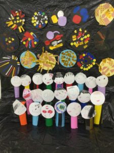 今月の壁面制作として年少・年中さんは花火を作りました。