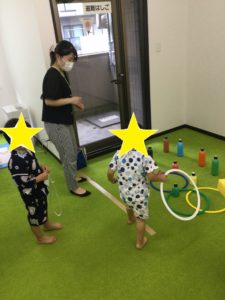 輪投げも大人気でした!!カラフルなペットボトルにむけて輪っかを投げていきます。みんな諦めずに最後まで頑張りました!