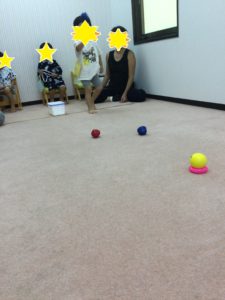 体を動かす遊びではパラリンピックの競技種目でもあるボッチャを行いました。狙いを定めてボールを転がしていきます。