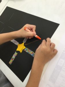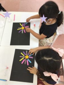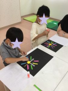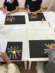 3歳までのお子さまたちが、素敵な「海」を作ってくれたので、お兄さん、お姉さんたちは、夜空🌙に打ちあがる花火を製作しました。