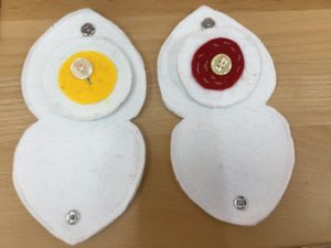 ①好きな具材(たまご・うめぼし・たかな・いくら)を選んでボタンつけをします。