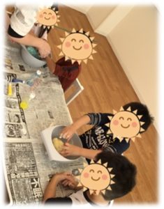 さらさら~からベタベタ~になり最後にはモチモチっとなる感触を楽しみながらお友達と頑張って作り上げることができましたよ☆