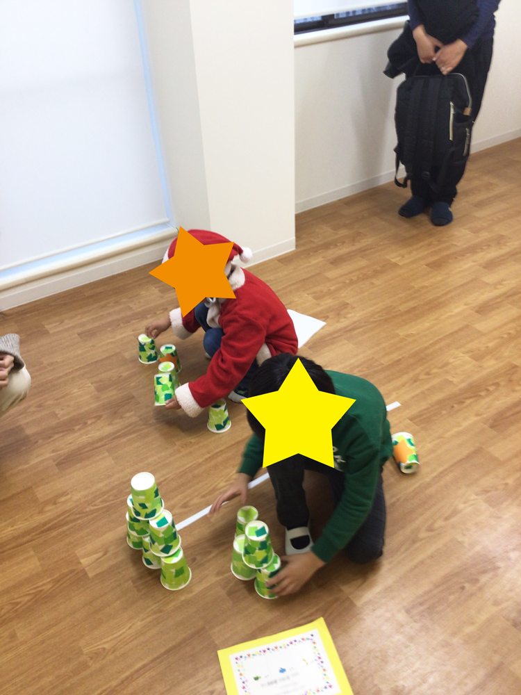 紙コップを使ったクリスマスツリーを作ったり、サンタさんやトナカイの絵柄を合わせていくクリスマスパズルや、壁に貼ってある様々な絵の中から見本のサンタさんと同じものを探すサンタ探しなど、各部屋を回って様々なあそびを楽しみます☺