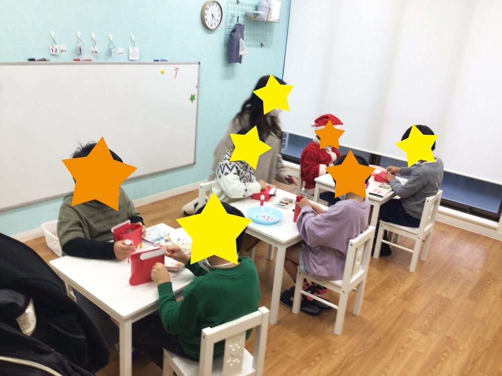各部屋でのあそびが終わると次はクリスマスのバッグを作っていきます!みんなバッグに紙を貼ったり、絵を描いたり楽しそうに取り組んでいます(*’▽’)