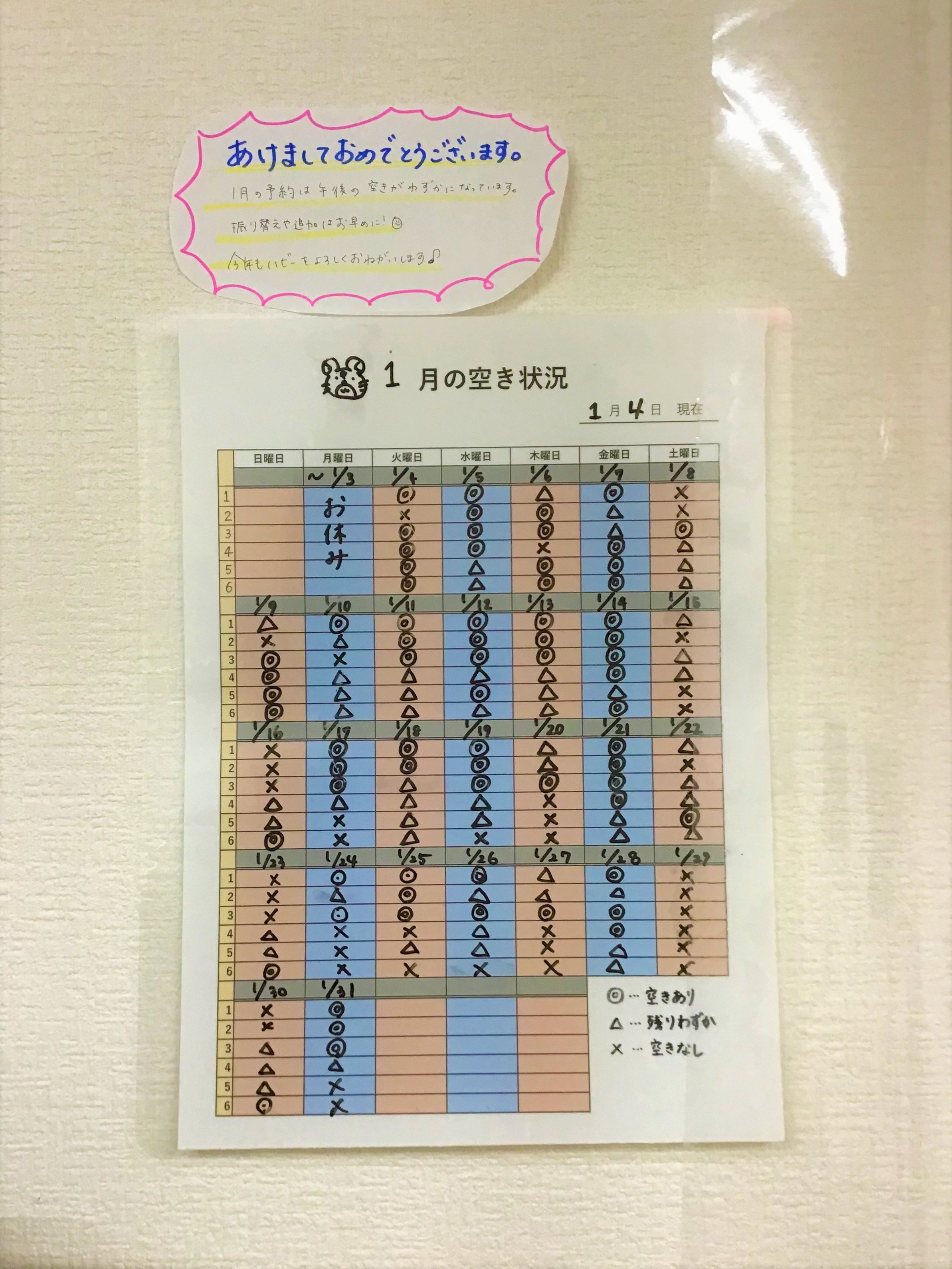 教室内の掲示板やモニタールームにも最新の空き状況表を掲示してありますので、合わせてそちらもご覧下さいませ。
