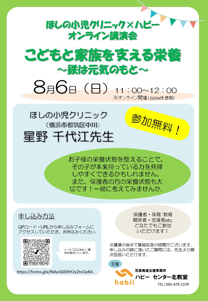8月6日にセンター北教室の協力医療機関である、「ほしの小児クリニック」星野先生による栄養についてのご講演イベントを行います。