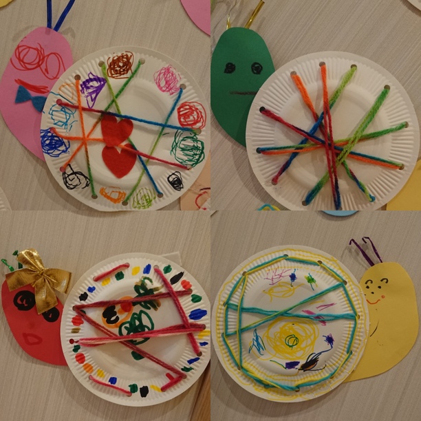 今回のみんなの作品では、紙皿に自由に絵を書いたり毛糸を通したりと夏に向けて元気いっぱいなカタツムリが完成しました☺♬✨