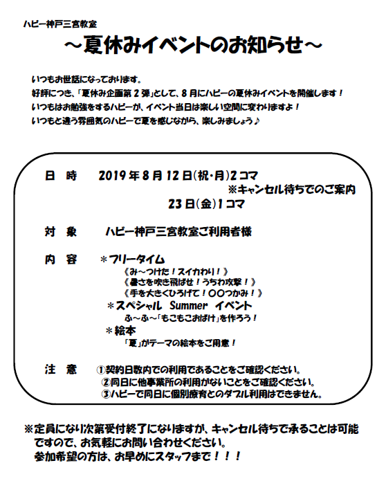 【神戸三宮】夏休み企画第二弾のおしらせ(8月12日・23日)